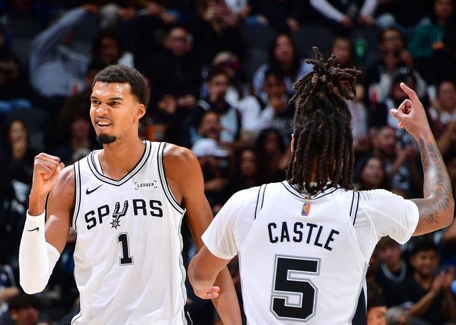 “扣籃!文班!”卡斯?fàn)栆贿吀吆耙贿呥\(yùn)球飛奔推進(jìn)。這是馬刺隊(duì)賽季揭幕戰(zhàn)客場戰(zhàn)勝獨(dú)行俠的第二節(jié)的一個畫面。幾乎就在卡斯?fàn)柡俺鲞@句話的同時(shí),文班亞馬用右臂頂開緊追不舍的德懷特·鮑威爾,奮力沖向籃筐,完成了最后的加速。在越過中圈標(biāo)志幾步之后,卡斯?fàn)枓伋鲆挥浉叩跚?,文班亞馬在空中接住球,完成了一記反手雙手扣籃。文班亞馬和卡斯?fàn)柵d奮碰肩慶祝。替補(bǔ)席的馬刺球員一陣喧鬧,瘋狂慶祝這記技驚四座的扣籃。這張海報(bào)和隨后的慶祝畫面迅速在網(wǎng)絡(luò)上瘋傳,兩位過去兩年的年度最佳新秀進(jìn)行了一次默契配合,并且展現(xiàn)了驚人的天賦。