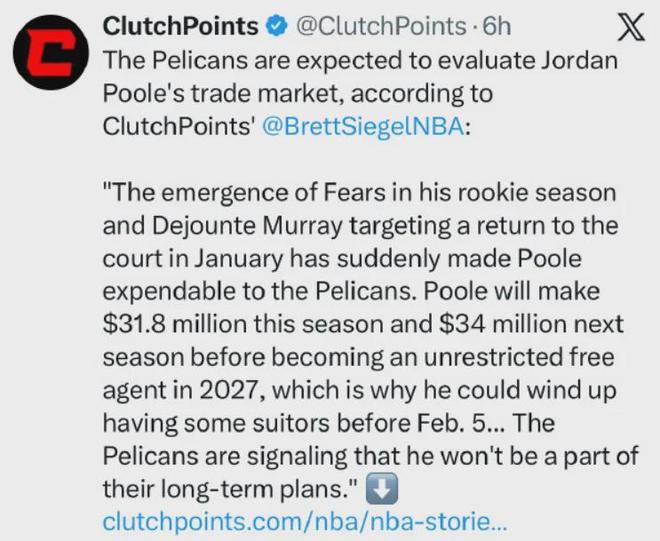 近日名記Siegel報道,隨著今年首輪7號秀費爾斯的崛起,以及默里將在明年1月份回歸,普爾在鵜鶘隊內(nèi)的地位突然變得可有可無,已經(jīng)被擺上貨架評估他的交易價值,不會是球隊長期計劃的一部分。